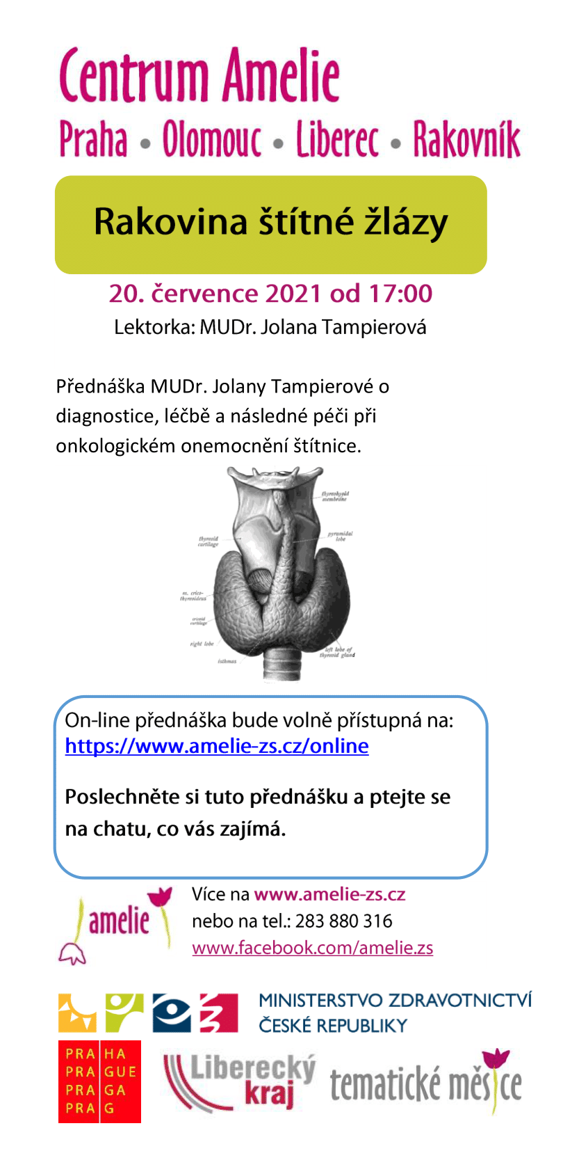 Online přednáška MUDr. Jolany Tampierové o diagnostice, léčbě a následné péči při onkologickém onemocnění štítné žlázy.
